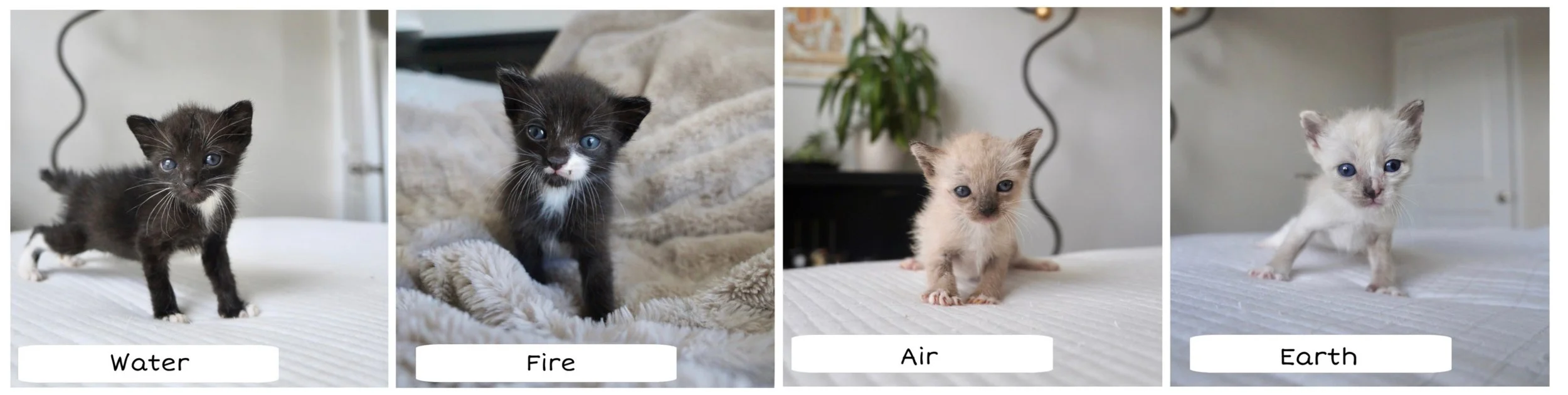 September 3rd, 2024, I took in four 2-week-old kittens, named them Earth, Water, Fire, and Air.